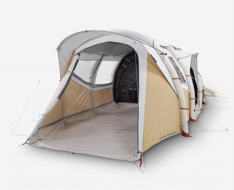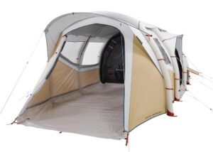De Quechua Air Seconds 6.3 Fresh & Black is een opblaasbare tent van Decathlon’s eigen merk Quechua. Hij heeft maar liefst twee slaapcabines. Een derde slaapruimte is optioneel, maar die is niet verduisterend en gaat ten koste van de leefruimte. Wanneer er twee volwassenen in een slaapruimte liggen, is er ook niet veel plek meer over voor bagage. Gelukkig kun je die allemaal kwijt in de leefruimte. Heb je dan nog te weinig ruimte? Dan is de Quechua Air Seconds 6.3 XXL Fresh & Black misschien een betere optie voor jou.